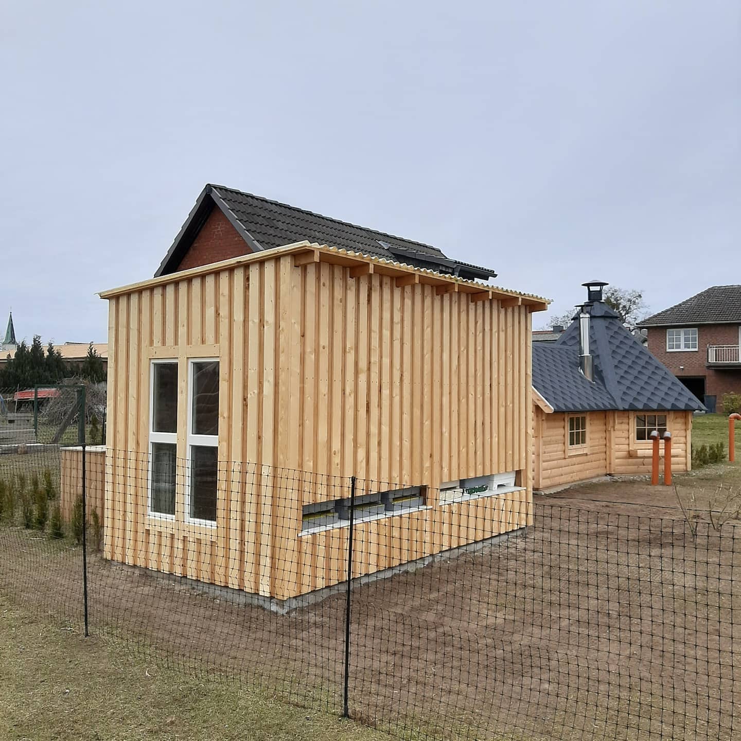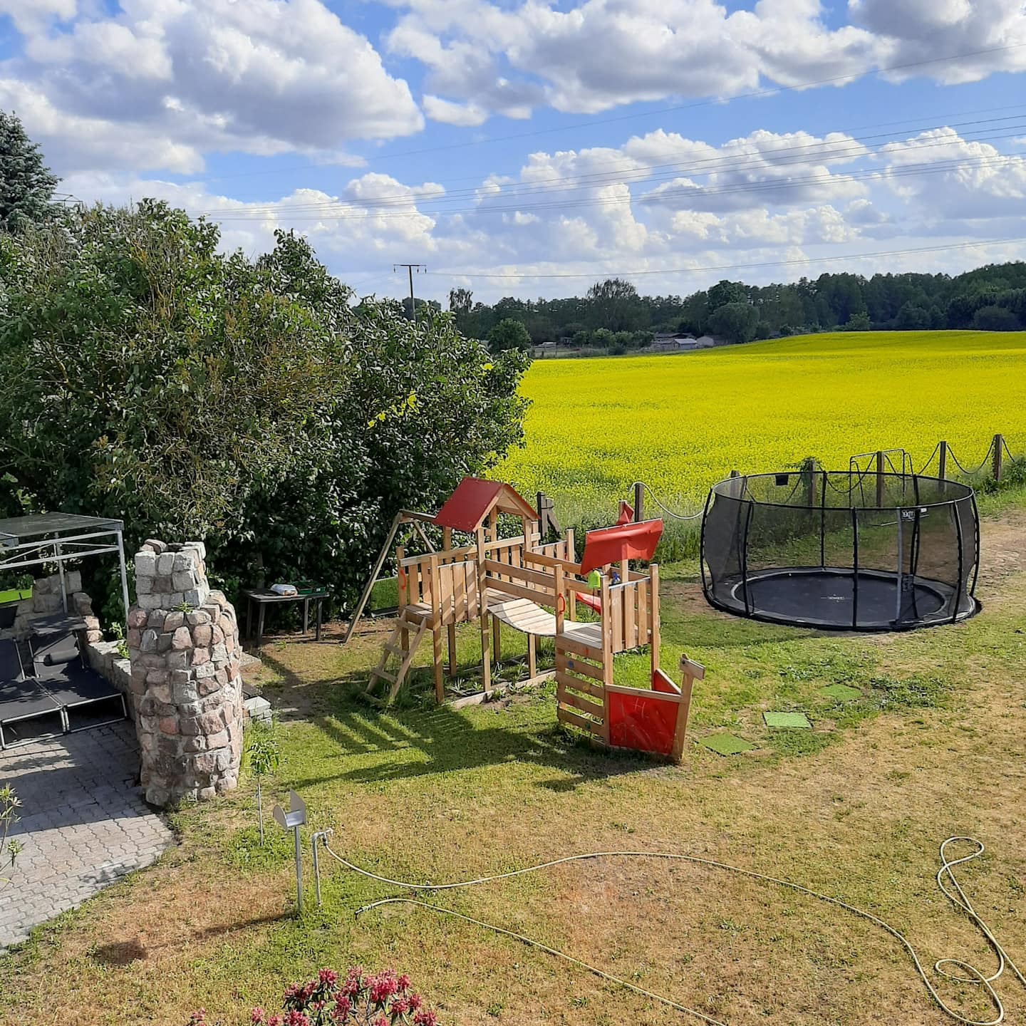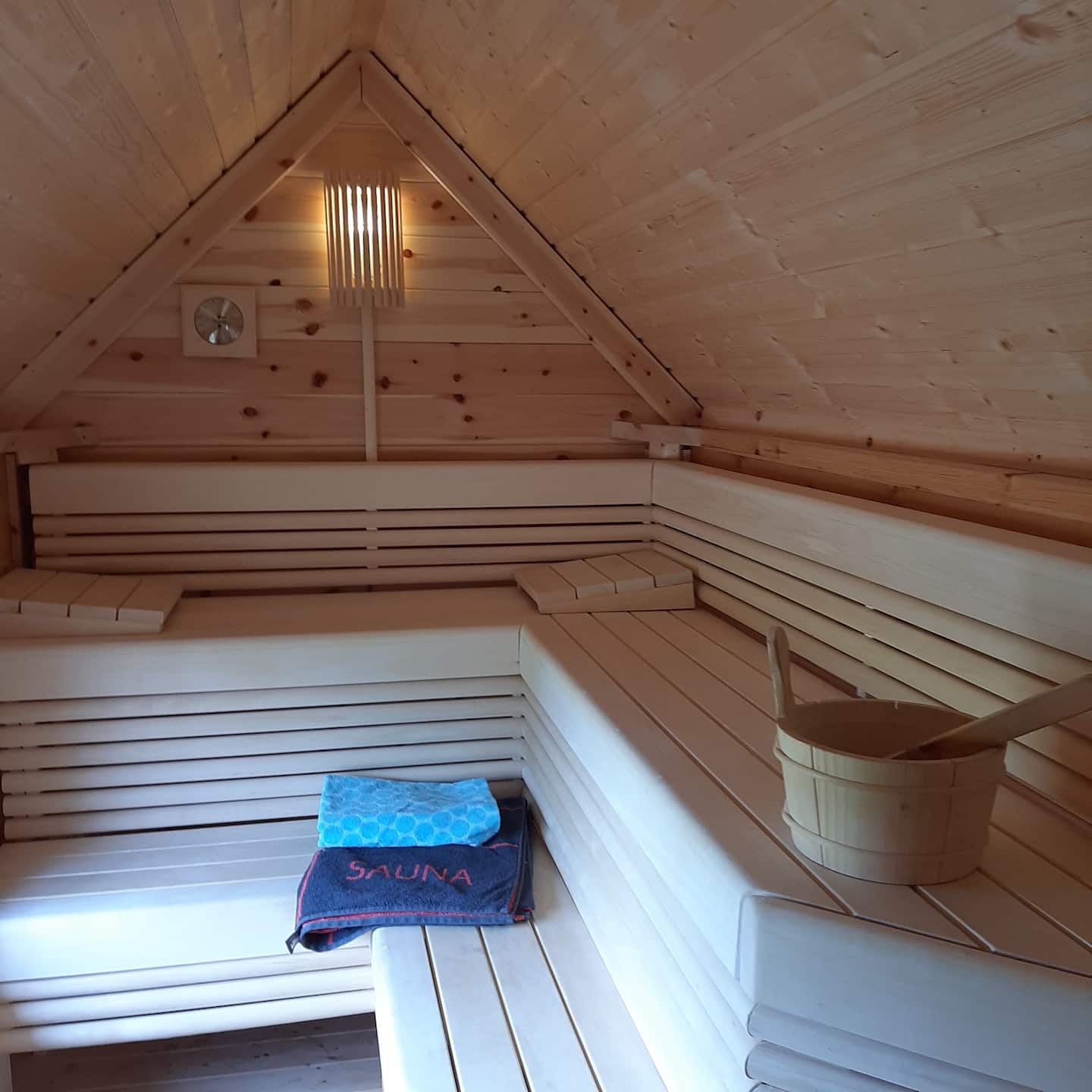 Auf dem eingezäunten Grundstück gibt es außerdem eine Terrasse mit Grillecke, Trampolin, Kinderspielplatz, Sauna, Whirlpool und Wildbeobachtungsstand.